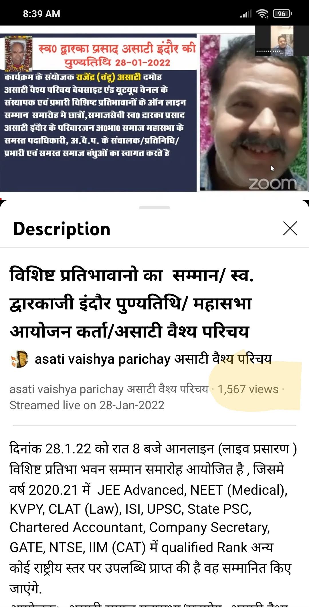 असाटी वैश्य परिचय पर प्रकाशित you tube वीडियो फोटो/dt. 28.1.22 को विशिष्ट प्रतिभावानो का ऑनलाइन सम्मान कार्यक्रम का लाइव प्रसारण -