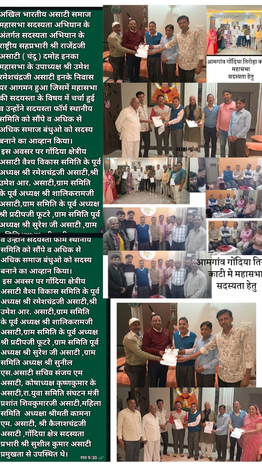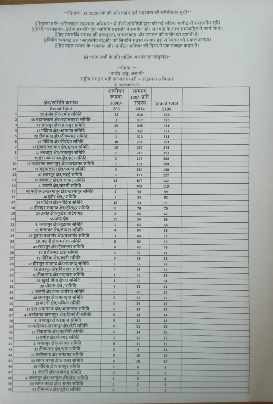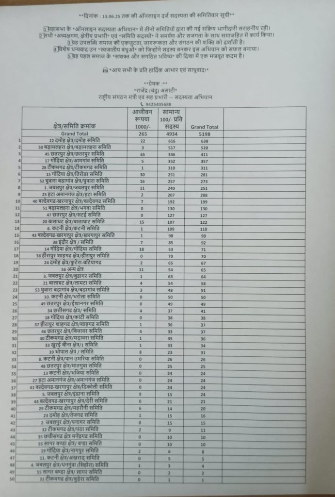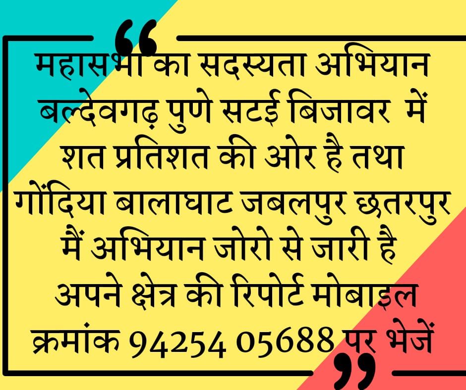 1- महासभा की सदस्यता सटई, बिजावर, पुणे,बल्देवगढ़ आमगांव, बालाघाट, लामटा धुवारा में पूर्णता की ओर है ।