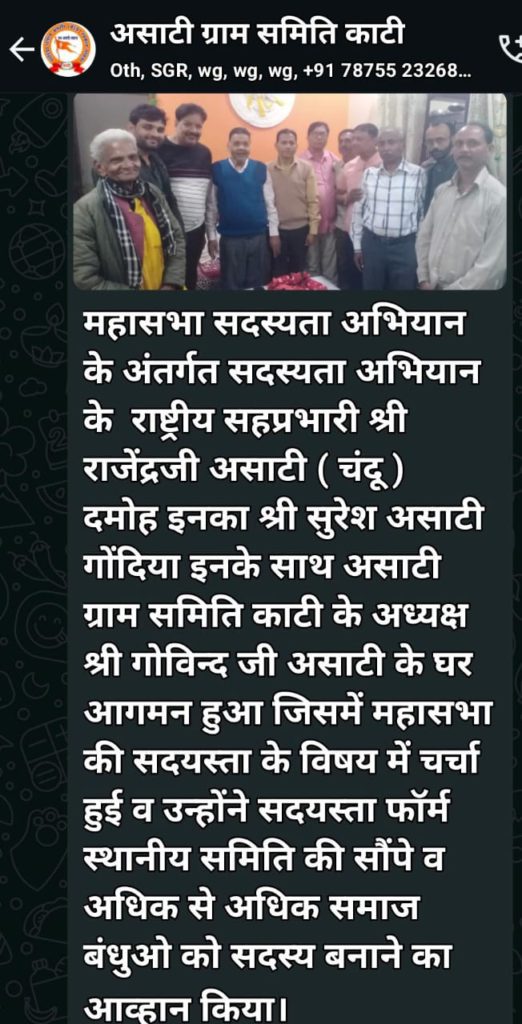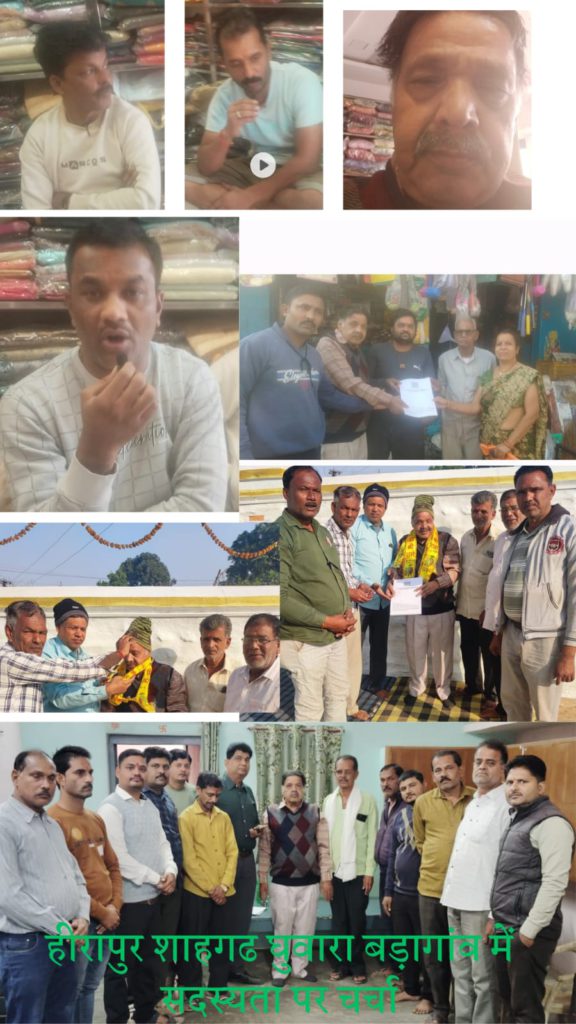 2- तिरोडा, बुढागर छतरपुर, शाहगढ, घुवारा, बड़ागांव, हटा, अमानगंज, पनागर इंद्राणा, कांटी, कटनी मैं स्थानीय समितियों एवं क्षेत्र प्रभारियों क़ो महासभा की सदस्यता की बुकलेट सौंपकर इस कार्य हेतु प्रतिनिधियों की नियुक्ति के संबंध में चर्चा की गई 🙏🙏 🙏🙏