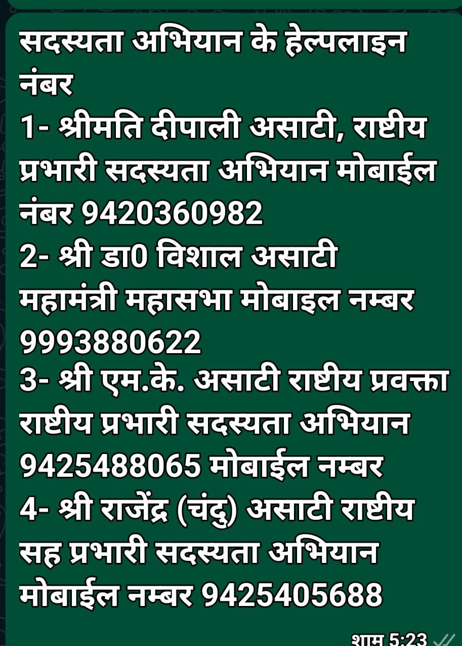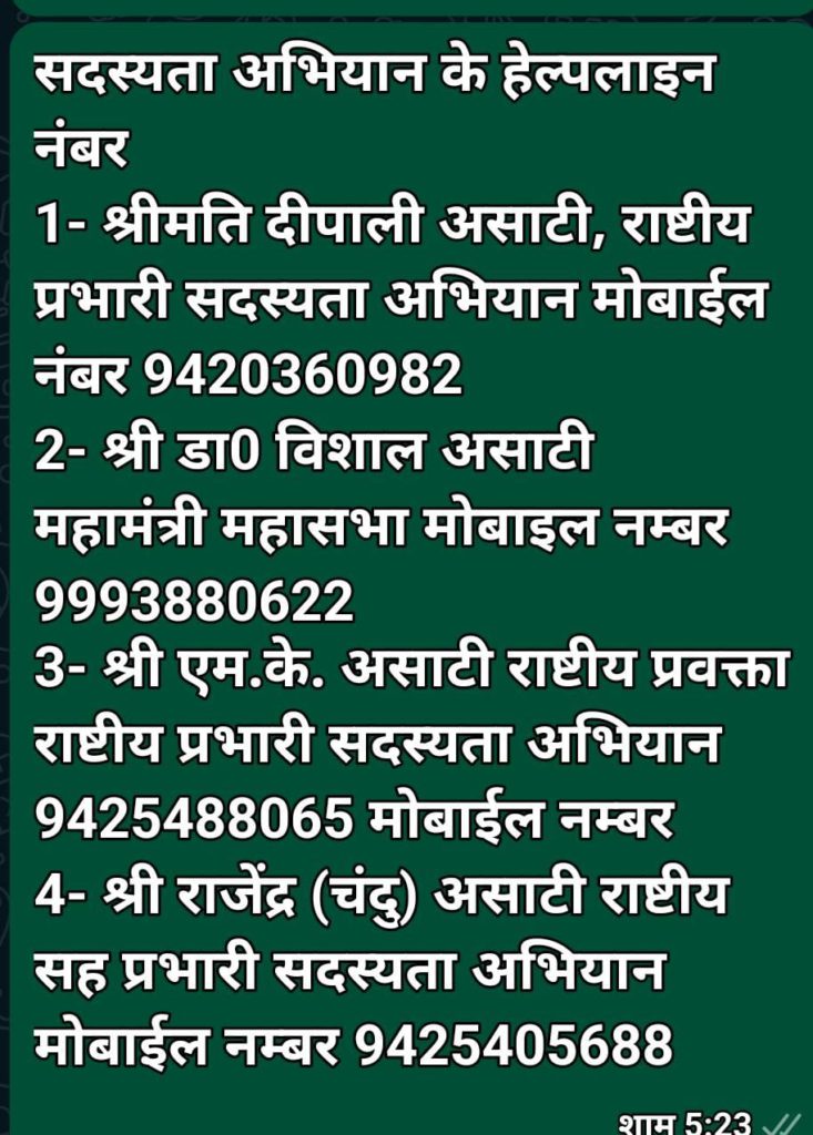 *नोट.. किसी भी प्रकार की आनलाइन प्रक्रिया में आने वाली परेशानी के लिए राष्ट्रीय सह प्रभारी (सदस्यता अभियान) श्री राजेंद्र ( चंदू) असाटी जी (9425405688) से मोबाइल नंबर पर संपर्क कर सकते हैं।