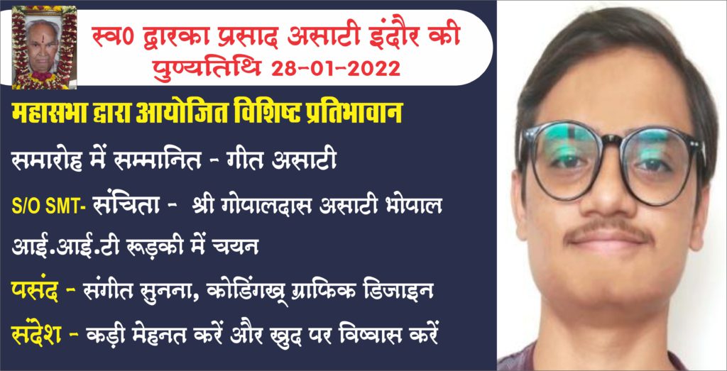 स्वचलित फोटो स्लाइडर दो---लेटेस्ट.रीसेंट अपडेट --- विशिष्ट प्रतिभावानो का सम्मान स्व. द्वारकाजी इंदौर की पुण्यतिथि आयोजनकर्ता.-महासभा/सहयोग असाटी वैश्य परिचय