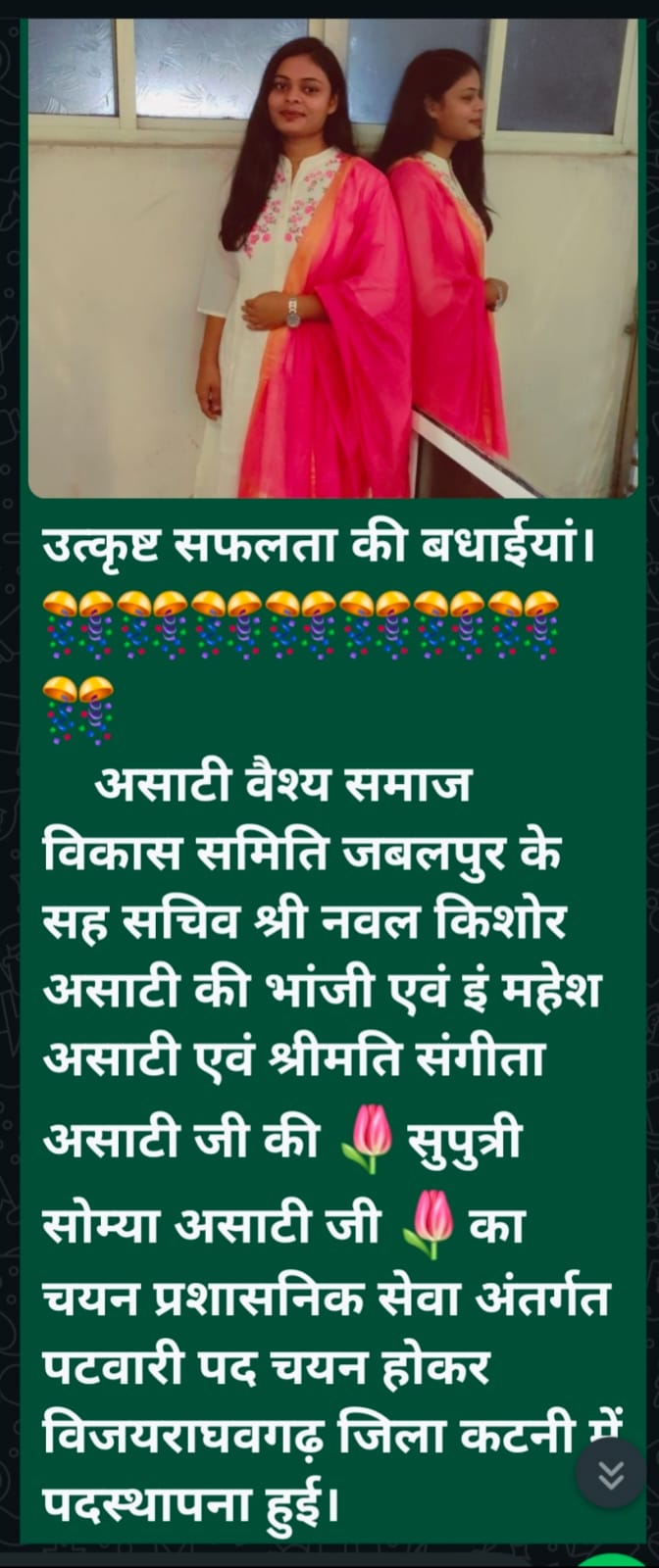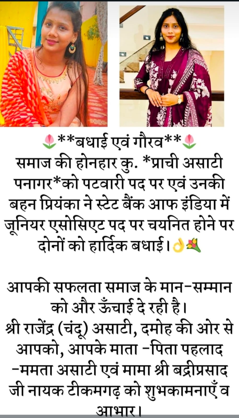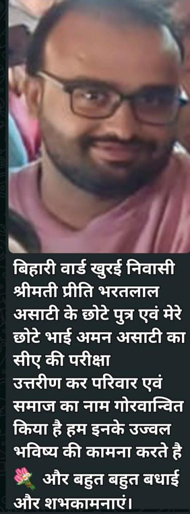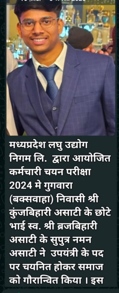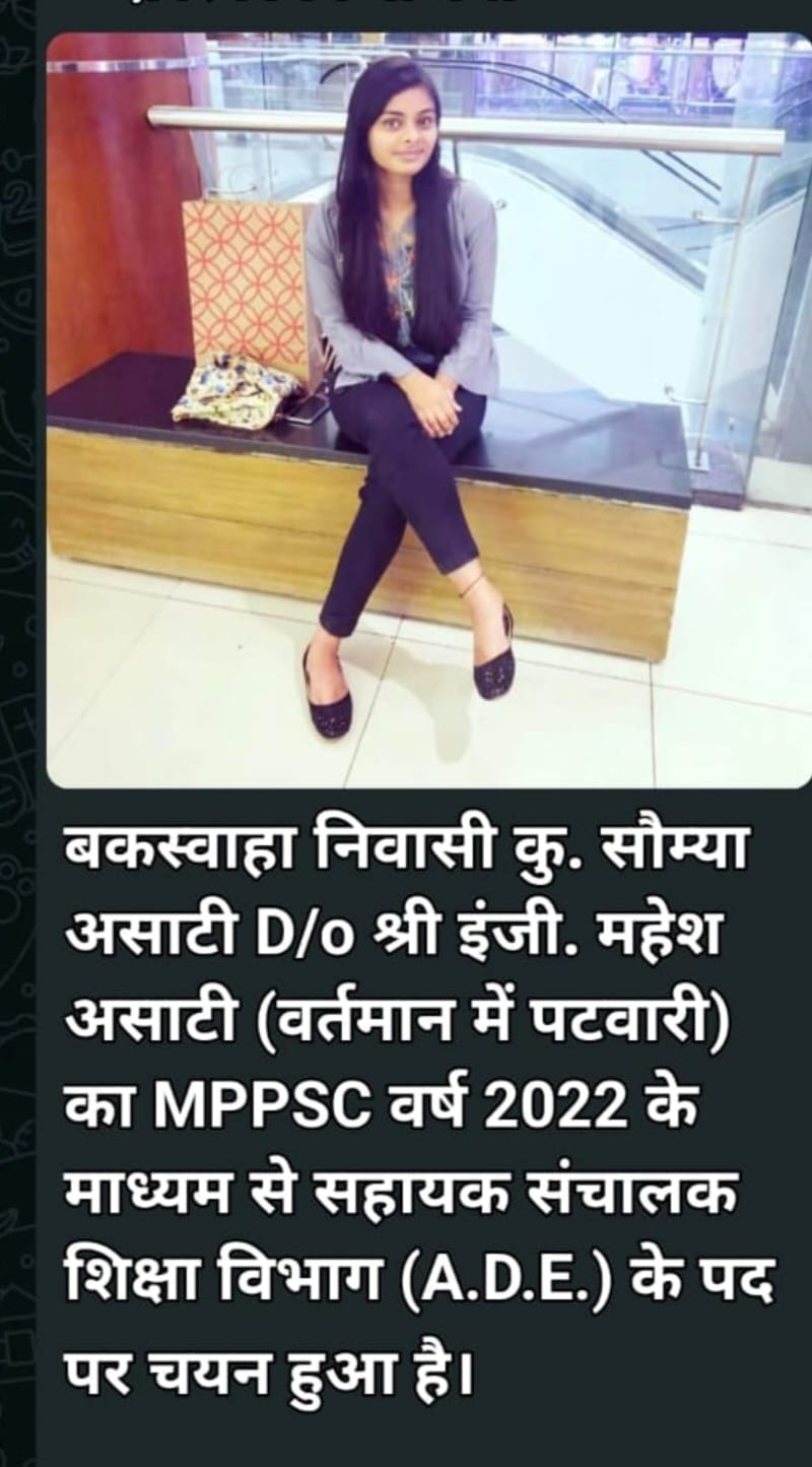 अखिल भारतीय असाटी समाज महासभा के अध्यक्ष आदरणीय श्री वीरेन्द्र असाटी जी एवं अन्य समाज सेवियों द्वारा एमपीपीएससी 2022 में चयनित कु.सौम्या असाटी (Assistant Director Education)को बकस्वाहा पहुंचकर बधाई एवं शुभकामनाएं प्रस्तुत की गईं।