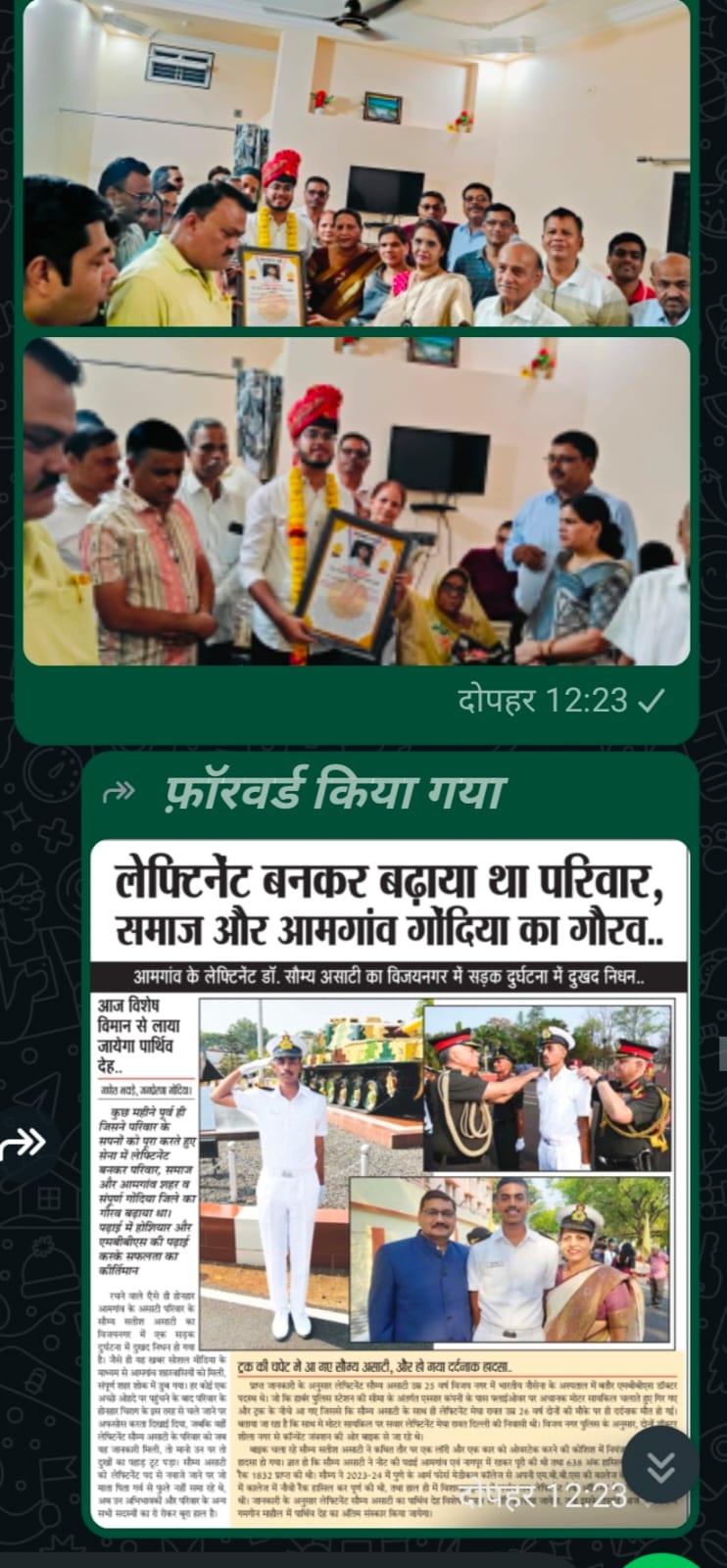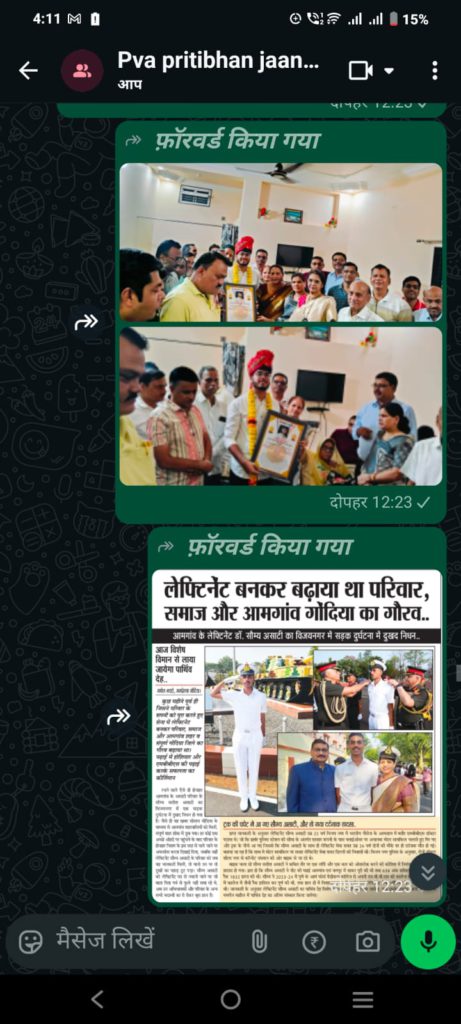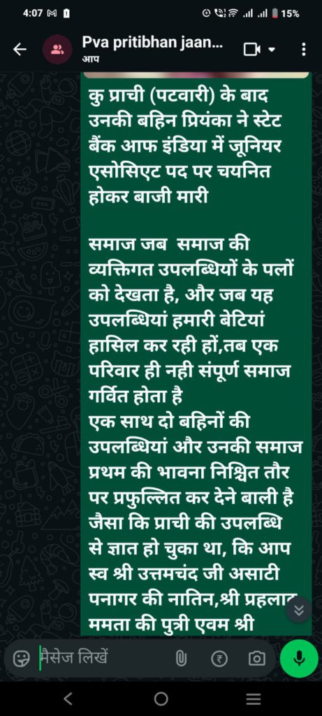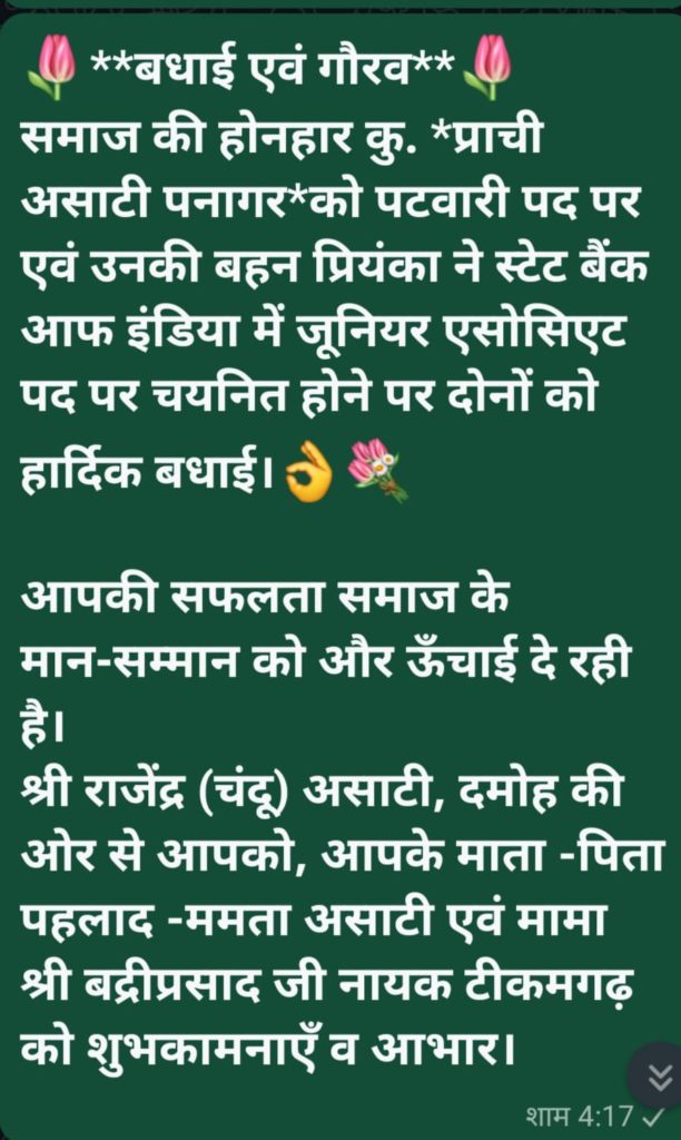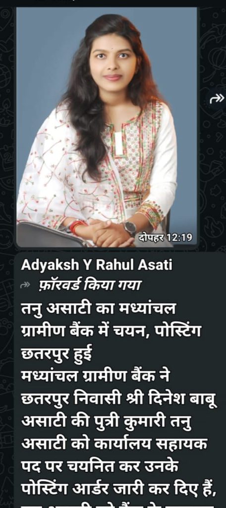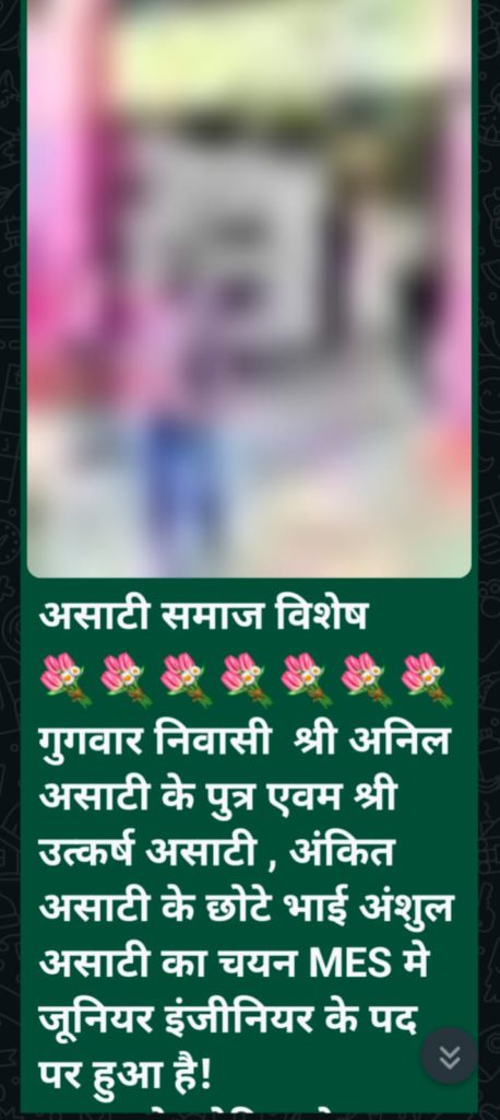 अखिल भारतीय असाटी समाज महासभा के अध्यक्ष आदरणीय श्री वीरेन्द्र असाटी जी एवं अन्य समाज सेवियों द्वारा एमपीपीएससी 2022 में चयनित कु.सौम्या असाटी (Assistant Director Education)को बकस्वाहा पहुंचकर बधाई एवं शुभकामनाएं प्रस्तुत की गईं।